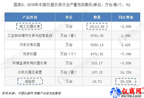 2018年電工儀器儀表、光學(xué)儀器、環(huán)境監(jiān)測專用儀器儀表產(chǎn)量下降,其余儀器儀表產(chǎn)量提高,其中試驗機的產(chǎn)量提高幅度最大,同比增速29.2%。電工儀器儀表產(chǎn)量最高,2018年為22112.56萬臺,同比下降2.55%。