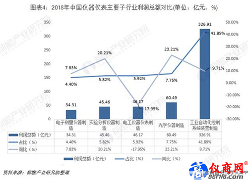 2018年儀器儀表子行業(yè)中主營收入排名第一的子行業(yè)是工業(yè)自動化控制系統(tǒng)裝置制造,實現(xiàn)利潤總額326.91億元,同比增長9.71%。光學(xué)儀器制造、電工儀器儀表制造、實驗分析儀器制造和電子測量儀器制造分別排名二至五位,利潤總額分別為60.49億元、46.17億元、45.46億元和34.31億元。