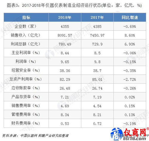 2018年儀器儀表行業(yè)經(jīng)濟運行指標(biāo)中銷售收入、利潤總額、應(yīng)收賬款率和財務(wù)費用率較上年同期增長,其余7個指標(biāo)較上年同期略有下降。其中儀器儀表制造業(yè)實現(xiàn)利潤總額780.49億元,比上年增長6.93%;主業(yè)利潤率為8.44%,比上年下降0.06個百分點??偟膩碚f,儀器儀表行業(yè)經(jīng)濟運行質(zhì)量與去年基本持平。