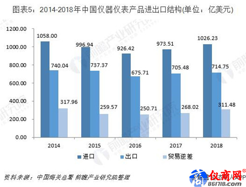 從下圖可以看出,我國儀器儀表產(chǎn)品長期處于進(jìn)出口貿(mào)易逆差的狀態(tài),2018年我國進(jìn)口儀器儀表產(chǎn)品金額達(dá)到1026.23億美元,出口金額714.75億美元,貿(mào)易逆差繼續(xù)擴大至311.48億美元。