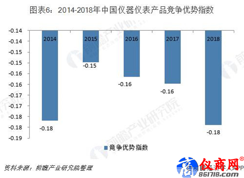 2014-2018年儀器儀表競爭優(yōu)勢指數(shù)維持在(-0.3,0)區(qū)間,2018年為-0.18,說明儀器儀表產(chǎn)品在全球具有微弱的競爭劣勢。
