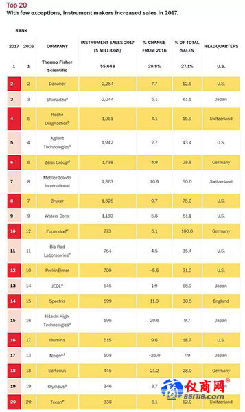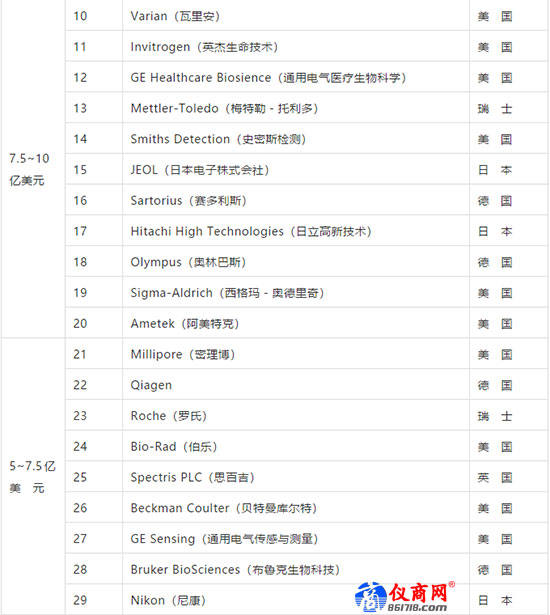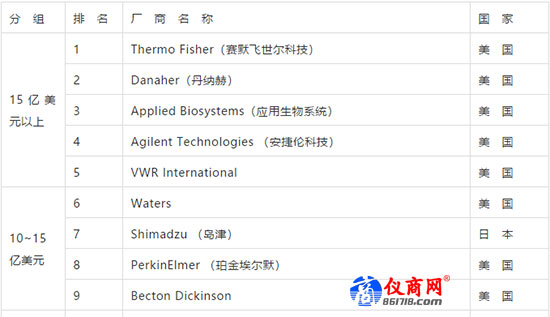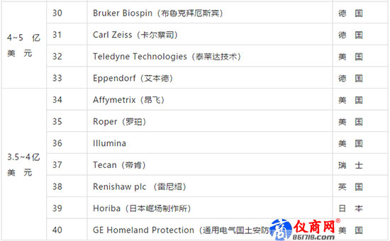 在Top40的名單中,美國廠商占據(jù)了半數(shù)以上,上榜企業(yè)達(dá)到22家,而且銷售收入在15億美元以上的5位廠商,均是來自美國,包括賽默飛世爾、丹納赫和安捷倫。