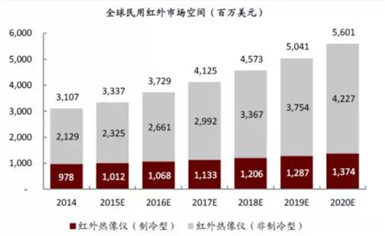 圖表: 2020年全球民用紅外市場(chǎng)約56億美元