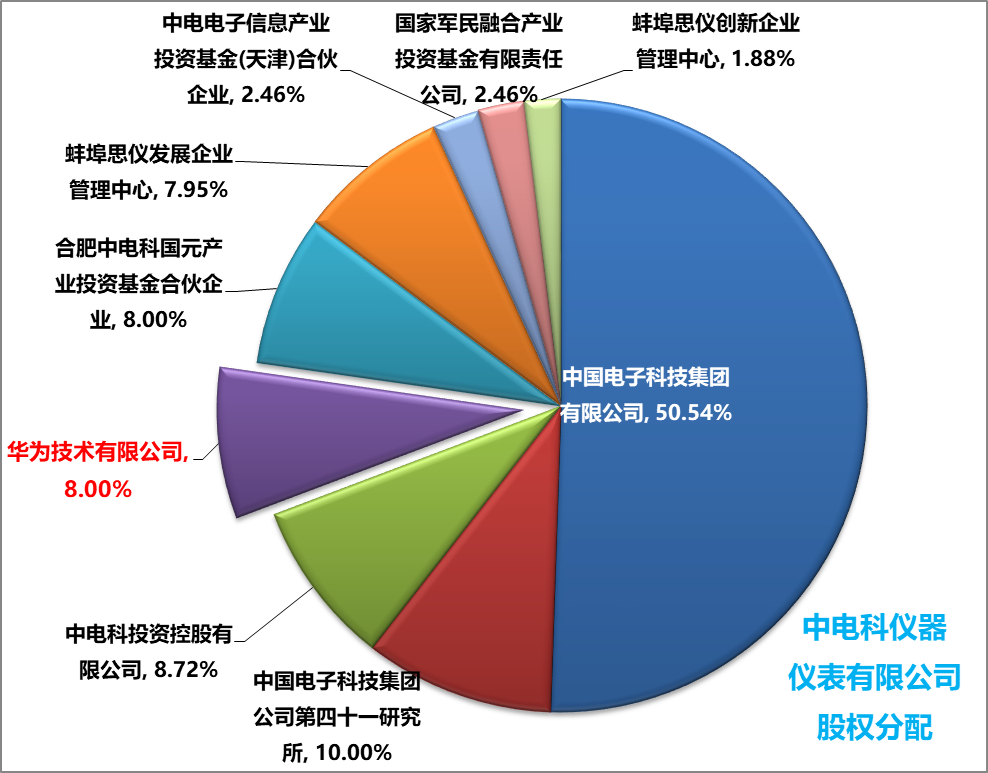 與華為一同入股中電儀器的還有7位股東(見下圖),華為是除去中電科四十一所、中電科投資控股有限公司外股份最多的企業(yè)之一。另外五家企業(yè)及投資機(jī)構(gòu)分別為:合肥中電科國元產(chǎn)業(yè)投資基金合伙企業(yè)、蚌埠思儀發(fā)展企業(yè)管理中心、國家軍民融合產(chǎn)業(yè)投資基金有限責(zé)任公司、中電電子信息產(chǎn)業(yè)投資基金(天津)合伙企業(yè)、蚌埠思儀創(chuàng)新企業(yè)管理中心。