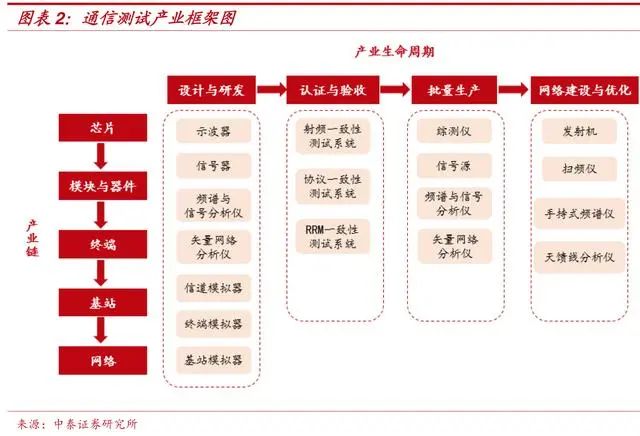 測試需求貫穿 5G 全產(chǎn)業(yè)鏈與全生命周期。通信測試技術(shù)與測試儀器是通信產(chǎn)業(yè)鏈中重要的一環(huán),滲透于通信芯片、模塊、終端、基站、無線網(wǎng)絡(luò)等幾乎所有的產(chǎn)業(yè)鏈環(huán)節(jié),同時(shí),貫穿于設(shè)計(jì)研發(fā)、認(rèn)證驗(yàn)收、生產(chǎn)、網(wǎng)絡(luò)建設(shè)與優(yōu)化等幾乎完整的產(chǎn)業(yè)生命周期。其中,設(shè)計(jì)與研發(fā)是使用測試儀器種類最多最廣的階段。通信測試,驗(yàn)證了通信新技術(shù)的可靠性與可行性,確定了產(chǎn)業(yè)鏈各環(huán)節(jié)的衡量基準(zhǔn),協(xié)調(diào)了產(chǎn)業(yè)鏈的完整性,幫助運(yùn)營商構(gòu)建新一輪網(wǎng)絡(luò)建設(shè)。