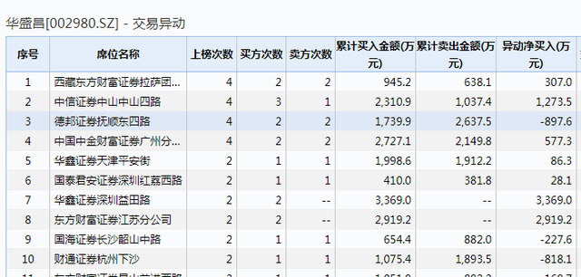 統(tǒng)計顯示,自華盛昌4月15日上市以來,龍虎榜單共計有57家營業(yè)部出沒,其中西藏東方財富證券拉薩團(tuán)結(jié)路第二證券營業(yè)部、中信證券中山中山四路證券營業(yè)部等4家營業(yè)部,上榜次數(shù)達(dá)到4次。
