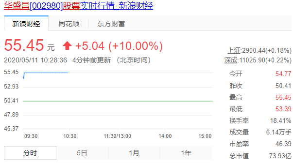 (5月11日,華盛昌再次漲停,股價漲到55.45元)