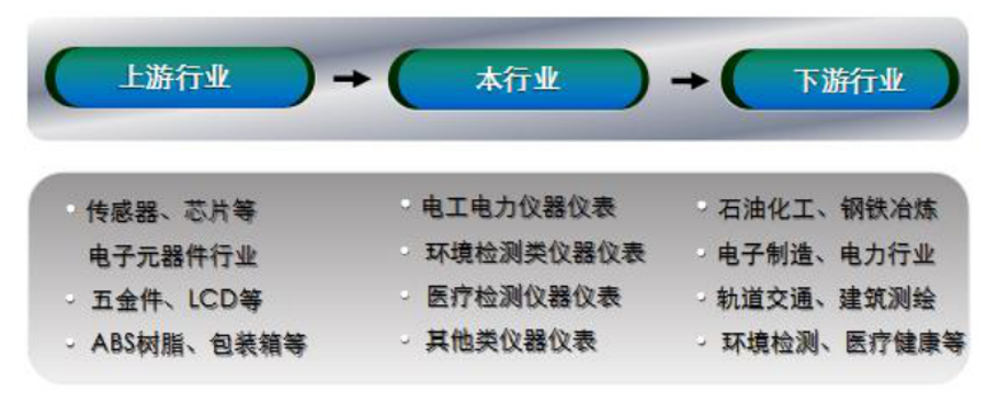 產(chǎn)業(yè)鏈上游企業(yè)主要包括傳感器、芯片、PCB、LCD 等電子元器件供應(yīng)商和五金件、包裝箱、線材、錫條等原料供應(yīng)商。行業(yè)的下游由石油化工、鋼鐵冶煉、電力電工、電子制造、建筑測繪、暖通空調(diào)、軌道交通、倉儲運(yùn)輸、環(huán)境監(jiān)測、醫(yī)療健康等多個行業(yè)構(gòu)成,行業(yè)產(chǎn)業(yè)鏈如下: