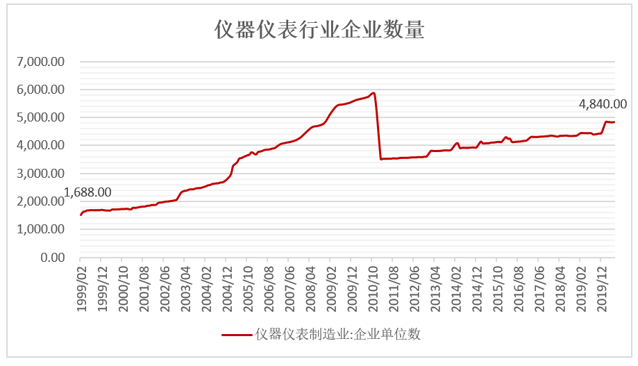 早在2015年,我國儀器儀表行業(yè)市場規(guī)模已超過 7000 億美元,成為全球儀器儀表生產(chǎn)大國。截止到2020年6月,國內(nèi)儀器儀表行業(yè)企業(yè)數(shù)量共計4840家,2019年主營業(yè)務(wù)收入7242億元,其中,儀器儀表行業(yè)上市公司共計38家,合計營收為377億元,占比5.2%。