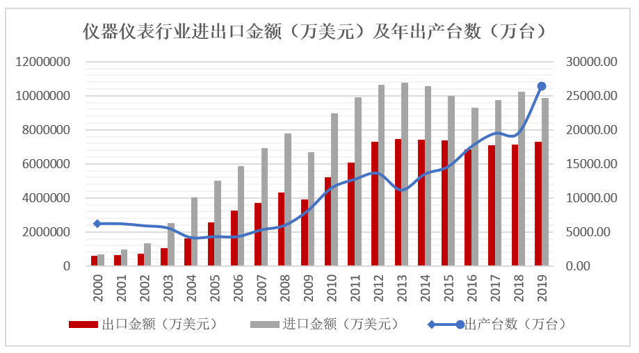 具體從數(shù)據(jù)上看,雖然國內(nèi)出貨臺數(shù)逐年攀升,尤其近5年來產(chǎn)量快速增長,但進(jìn)口規(guī)模仍然維持在一個較高的水平。Wind數(shù)據(jù)顯示,2017-2019年間,國內(nèi)儀器儀表出口交貨值平均約為1000億元,而進(jìn)口金額常年維持在1000億美元以上,對外依存度,尤其是高端儀表的依賴性仍然較強(qiáng)。