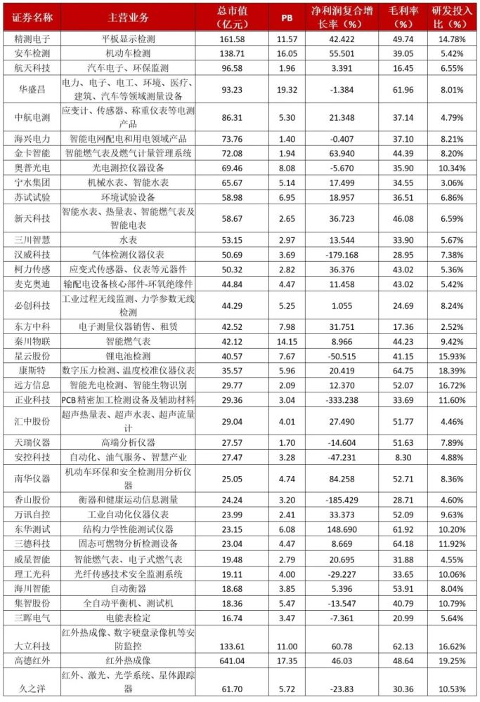 研發(fā)投入上看,行業(yè)平均值為8.86%。東華測試、南華儀器、金卡智能、大立科技、安車檢測、高德紅外、精測電子等13只個股研發(fā)占比在10%以上。但值得注意的是,該行業(yè)目前在科創(chuàng)板上市的數(shù)量并不多,近年來僅有一智能燃?xì)獗頌橹鳡I業(yè)務(wù)的秦川物聯(lián)在科創(chuàng)板掛牌。從某種程度上也說明,整個行業(yè)的研發(fā)投入增長是欠缺的。