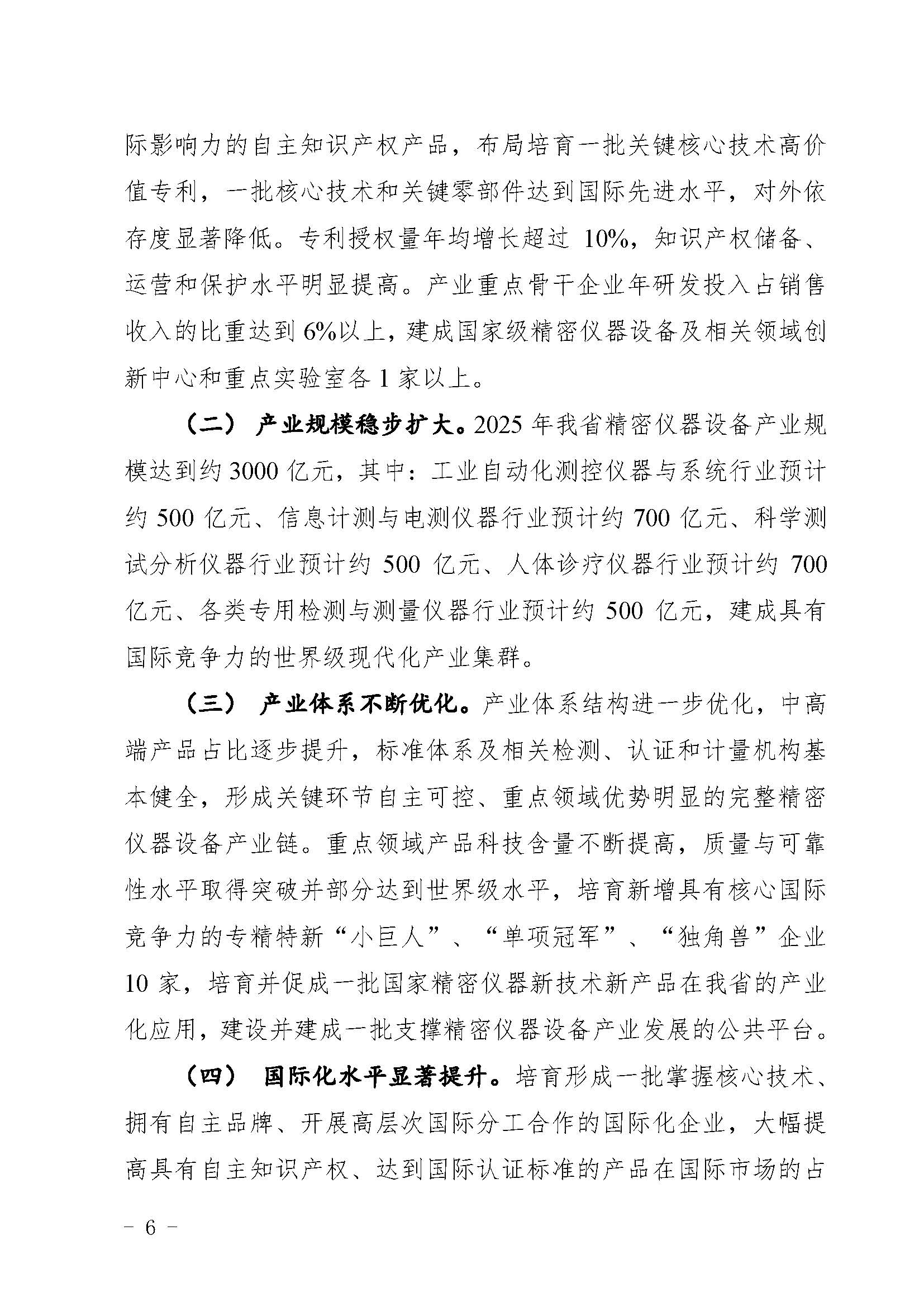 一是自主創(chuàng)新能力不斷增強(qiáng)。在重點(diǎn)領(lǐng)域取得核心技術(shù)研發(fā)與應(yīng)用突破,培育形成一批國(guó)內(nèi)領(lǐng)先、具有行業(yè)主導(dǎo)地位和國(guó)際影響力的自主知識(shí)產(chǎn)權(quán)產(chǎn)品,布局培育一批關(guān)鍵核心技術(shù)高價(jià)值專利,一批核心技術(shù)和關(guān)鍵零部件達(dá)到國(guó)際先進(jìn)水平,對(duì)外依存度顯著降低。二是產(chǎn)業(yè)規(guī)模穩(wěn)步擴(kuò)大。2025年我省精密儀器設(shè)備產(chǎn)業(yè)規(guī)模達(dá)到約3000億元。三是產(chǎn)業(yè)體系不斷優(yōu)化。產(chǎn)業(yè)體系結(jié)構(gòu)進(jìn)一步優(yōu)化,中高端產(chǎn)品占比逐步提升,標(biāo)準(zhǔn)體系及相關(guān)檢測(cè)、認(rèn)證和計(jì)量機(jī)構(gòu)基本健全,形成關(guān)鍵環(huán)節(jié)自主可控、重點(diǎn)領(lǐng)域優(yōu)勢(shì)明顯的完整精密儀器設(shè)備產(chǎn)業(yè)鏈。四是國(guó)際化水平顯著提升。培育形成一批掌握核心技術(shù)、擁有自主品牌、開(kāi)展高層次國(guó)際分工合作的國(guó)際化企業(yè)。