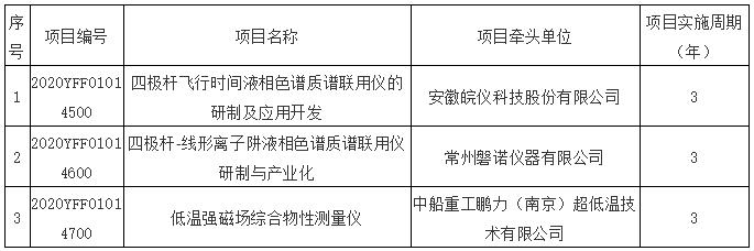 11月11日,科學(xué)技術(shù)部發(fā)布了國(guó)家重點(diǎn)研發(fā)計(jì)劃“重大科學(xué)儀器設(shè)備開(kāi)發(fā)”重點(diǎn)專項(xiàng)2020年度擬立項(xiàng)項(xiàng)目公示。公告顯示有三個(gè)項(xiàng)目擬立項(xiàng),分別是安徽皖儀科技股份有限公司的“四極桿飛行時(shí)間液相色譜質(zhì)譜聯(lián)用儀的研制及應(yīng)用開(kāi)發(fā)”、常州磐諾儀器有限公司的“四極桿-線形離子阱液相色譜質(zhì)譜聯(lián)用儀研制與產(chǎn)業(yè)化”以及中船重工鵬力(南京)超低溫技術(shù)有限公司的“低溫強(qiáng)磁場(chǎng)綜合物性測(cè)量?jī)x”。