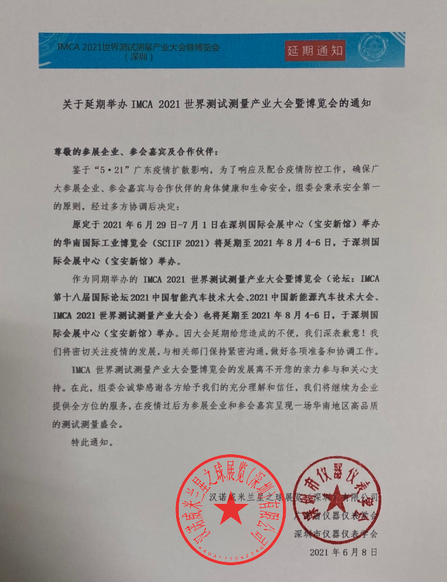 關(guān)于延期舉辦IMCA 2021世界測(cè)試測(cè)量產(chǎn)業(yè)大會(huì)暨博覽會(huì)的通知
