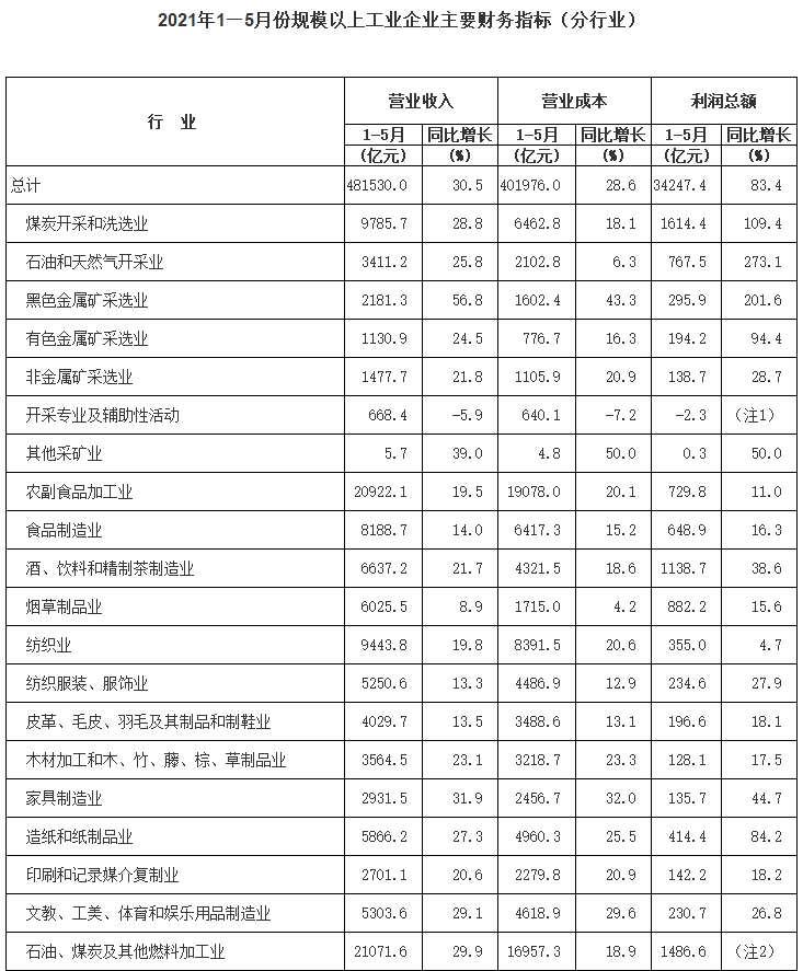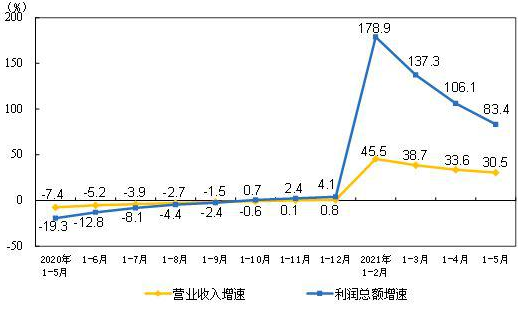 1-5月份,在41個工業(yè)大類行業(yè)中,39個行業(yè)利潤總額同比增加,1個行業(yè)扭虧為盈,1個行業(yè)實現(xiàn)減虧。主要行業(yè)利潤情況如下:有色金屬冶煉和壓延加工業(yè)利潤總額同比增長3.87倍,黑色金屬冶煉和壓延加工業(yè)增長3.77倍, 石油和天然氣開采業(yè)增長2.73倍,化學(xué)原料和化學(xué)制品制造業(yè)增長2.11倍,煤炭開采和洗選業(yè)增長1.09倍,汽車制造業(yè)增長81.1%,電氣機械和器材制造業(yè)增長49.8%,計算機、通信和其他電子設(shè)備制造業(yè)增長49.3%,通用設(shè)備制造業(yè)增長45.5%,專用設(shè)備制造業(yè)增長38.4%,非金屬礦物制品業(yè)增長30.3%,電力、熱力生產(chǎn)和供應(yīng)業(yè)增長24.7%,農(nóng)副食品加工業(yè)增長11.0%,紡織業(yè)增長4.7%,石油、煤炭及其他燃料加工業(yè)由同期虧損轉(zhuǎn)為盈利。