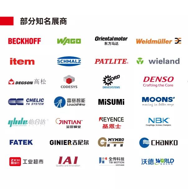 工業(yè)自動化代表展商:德國倍福、東方馬達、威瑯、 依諾信ITEM、米思米、萬可、魏德米勒、博恩斯坦、宜科、施邁茨、施邁賽、電裝DENSO、鳴志、永宏、雷賽、艾衛(wèi)艾、怡合達、沃德、町洋、亞控,力控、慷博、杭州永創(chuàng)、斯坦德、NBK、NB、TBI MOTION、UBC、仕達通、碧綠威、桃子、澤達、仕瑞達、華成工控、圖靈、氣立可、日東、賽博、伙伴、嘉準、科瑞、欣靈電氣、吉尼爾、長江電氣、科捷、固安捷、科力爾、米博、紅獅…….