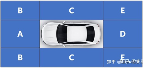 車輛周邊區(qū)域,可以大致劃分為4大區(qū)域:正前區(qū)域A、側(cè)前區(qū)域B、側(cè)向區(qū)域C、后向區(qū)域D和側(cè)后區(qū)域E(如下圖):