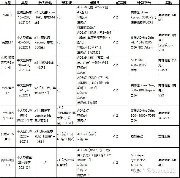 國內(nèi)主要高階自動駕駛車型傳感器方案