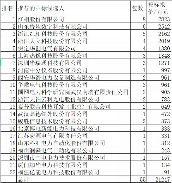 國(guó)網(wǎng)2021年儀器儀表總計(jì)招55包21247萬(wàn)元,由22家企業(yè)提供。
