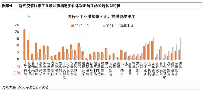 細(xì)分行業(yè)來看,采用目前數(shù)據(jù)齊全的2021年11月分行業(yè)累計(jì)同比增速與2019年相比:黑色、有色金屬采礦和冶煉業(yè)、化纖、非金屬制品、石油煤炭等燃料加工、燃?xì)夂兔禾块_采、皮毛制鞋、鐵路航空運(yùn)輸設(shè)備、儀器儀表、酒飲制造等,與綠色轉(zhuǎn)型相關(guān)的、受疫情嚴(yán)重影響的行業(yè),工業(yè)增加值兩年平均增速顯著落后于疫情前。而醫(yī)藥、金屬制品、通用和專用設(shè)備、非汽車制造、金屬采礦、文教娛樂、電器機(jī)械、電子設(shè)備等,即裝備制造類和高技術(shù)類行業(yè),工業(yè)增加值兩年平均增速已顯著超過疫情之前。