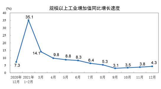 2021年12月份,規(guī)模以上工業(yè)增加值同比實(shí)際增長4.3%(以下增加值增速均為扣除價(jià)格因素的實(shí)際增長率),比2019年同期增長11.9%,兩年平均增長5.8%。從環(huán)比看,12月份,規(guī)模以上工業(yè)增加值比上月增長0.42%。分三大門類看,12月份,采礦業(yè)增加值同比增長7.3%;制造業(yè)增長3.8%;電力、熱力、燃?xì)饧八a(chǎn)和供應(yīng)業(yè)增長7.2%。