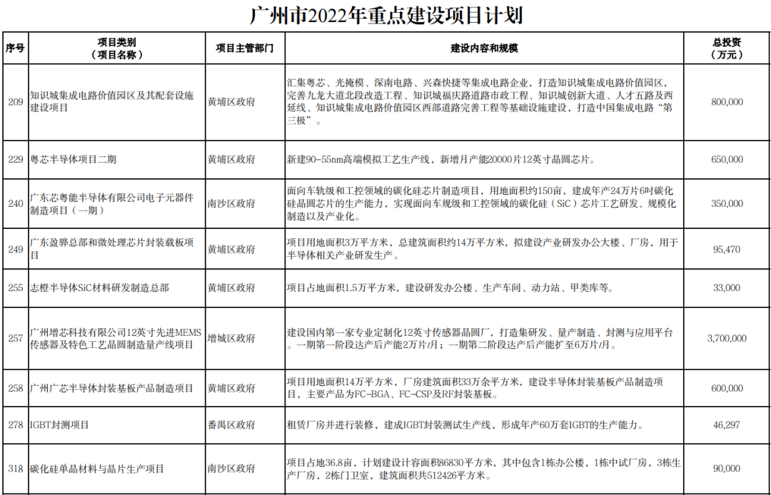 以下為廣州市2022年重點項目計劃部分半導體產(chǎn)業(yè)項目: