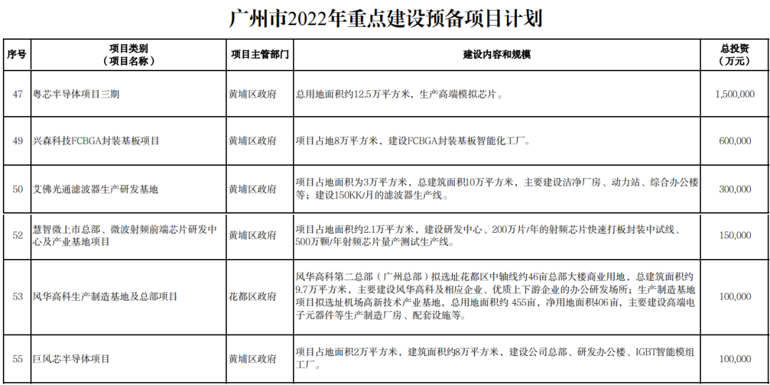 重點建設預備項目計劃包括粵芯半導體項目三期、興森科技FCBGA封裝基板項目、艾佛光通濾波器生產(chǎn)研發(fā)基地、風華高科生產(chǎn)制造基地及總部項目等。