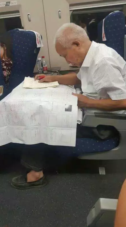 照片里,高鐵二等座上一位“鄰家大爺”,一頭銀白發(fā),一身舊衣裳,一雙舊皮鞋,襪子都不穿,手握一支筆,心無旁騖地審閱著一份專業(yè)圖紙。