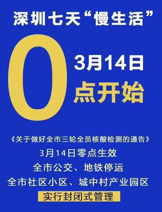 3月13日,深圳發(fā)布《關(guān)于做好全市三輪全員核酸檢測的通告》,宣布3月14日至20日期間,深圳實施“全市公交、地鐵停運。全市社區(qū)小區(qū)、城中村、產(chǎn)業(yè)園區(qū)實行封閉式管理。所有企業(yè)一律居家辦公,暫停生產(chǎn)經(jīng)營活動?!钡纫幌盗写胧?。
