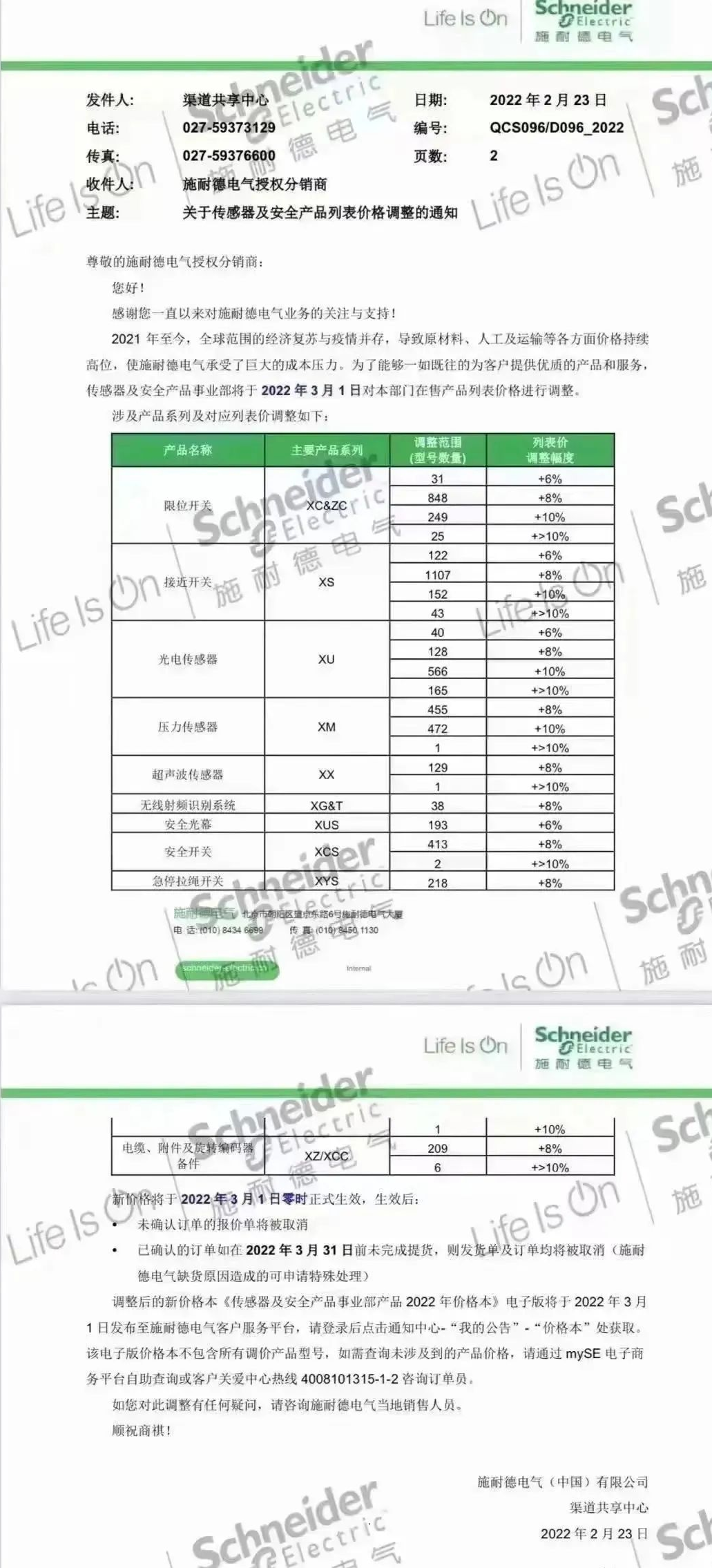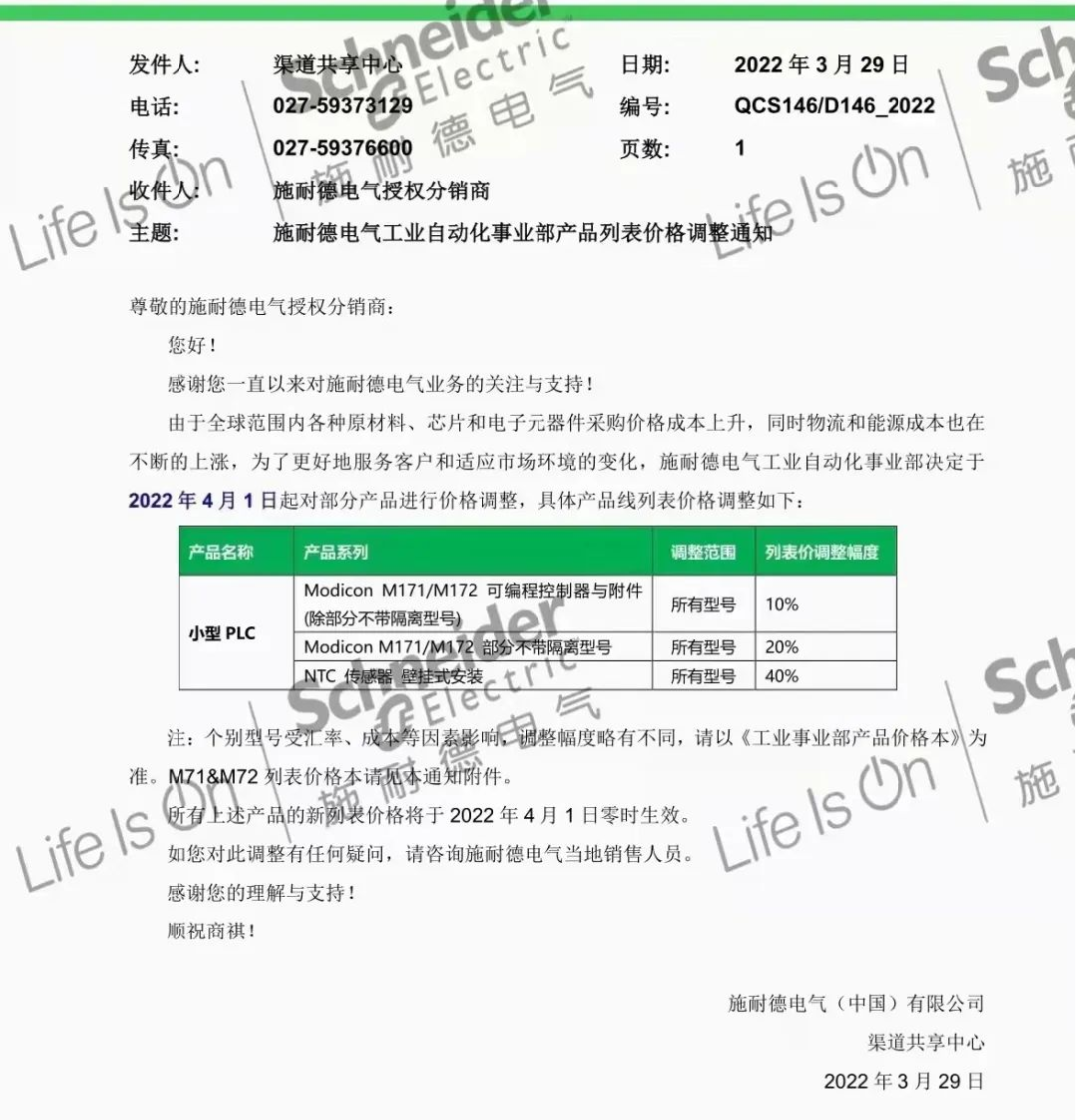 一、施耐德:多次上調(diào)價格,平均幅度為6%~10%,最高達40%