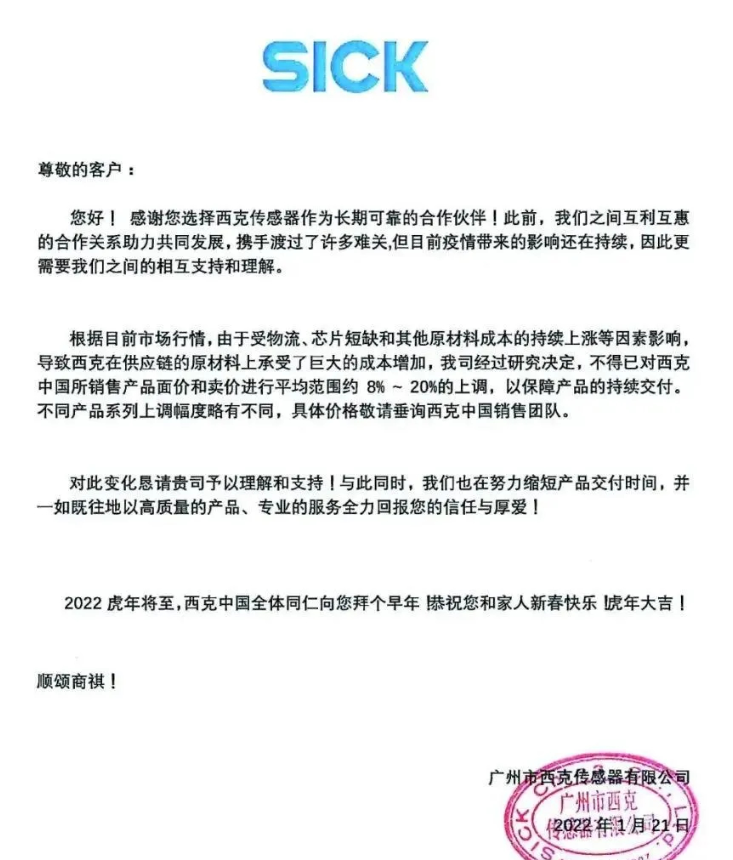 四、西克傳感器:1月起全產(chǎn)品調(diào)漲8%-20%