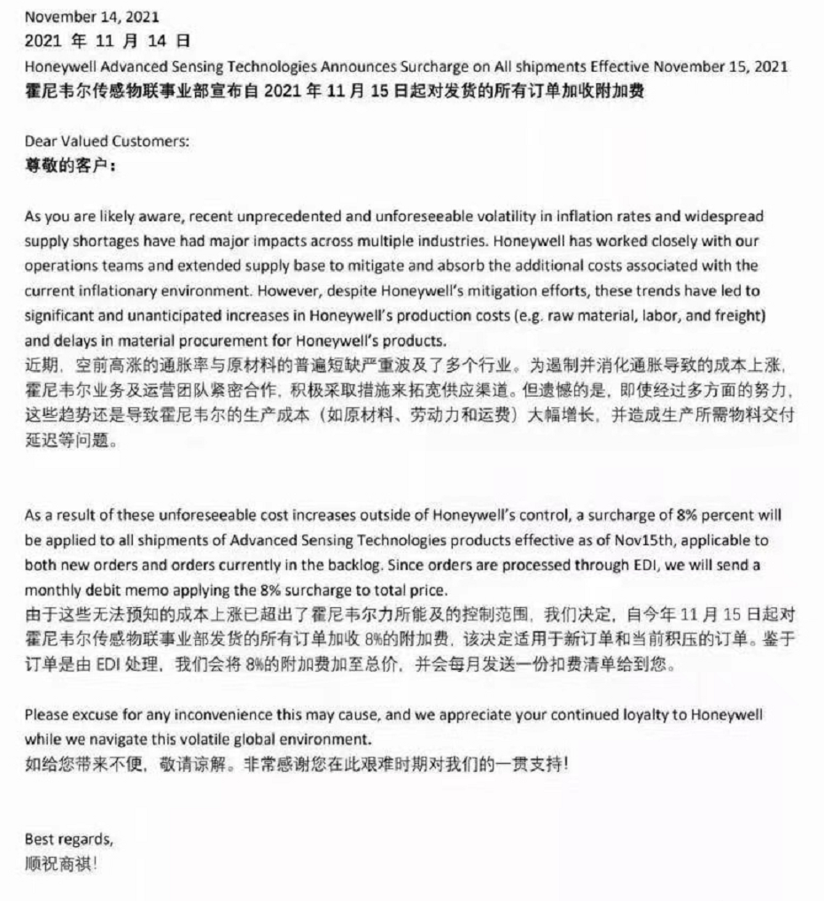 五、霍尼韋爾:去年11月起上調(diào)8%