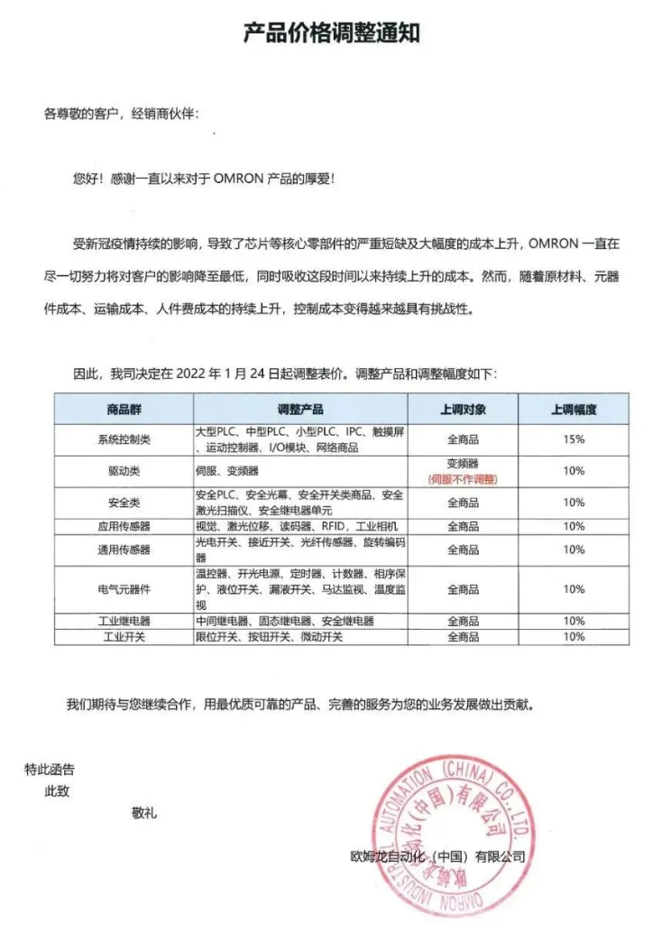 六、歐姆龍:1月起部分產(chǎn)品漲10%-15%