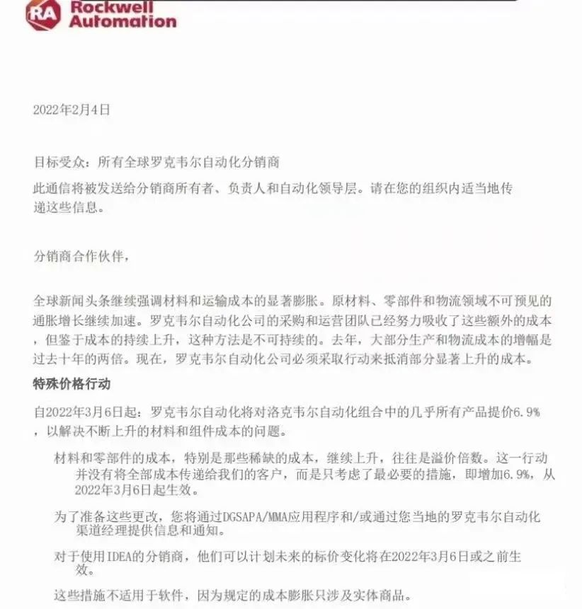 七、羅克韋爾:3月6日起自動化組合全產(chǎn)品提價6.9%