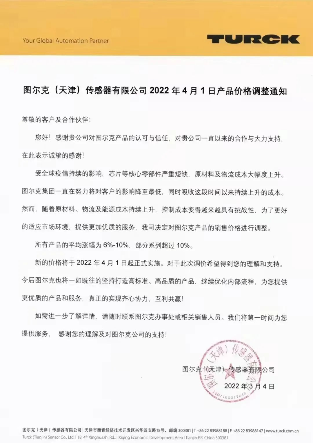 邦納將于2022年4月15日起進行產(chǎn)品調(diào)價,不同產(chǎn)品線將有4%及以上幅度的上調(diào)。另外,邦納將根據(jù)最新情況重新審核來決定是否延續(xù)過往價格,還是進行調(diào)整;未來可能會對成本變動比較大的產(chǎn)品再次進行相應(yīng)的價格調(diào)整。