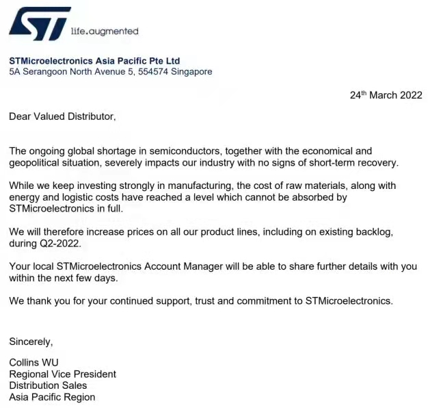 一、意法半導(dǎo)體:第二季度全產(chǎn)品將漲價,幅度未知