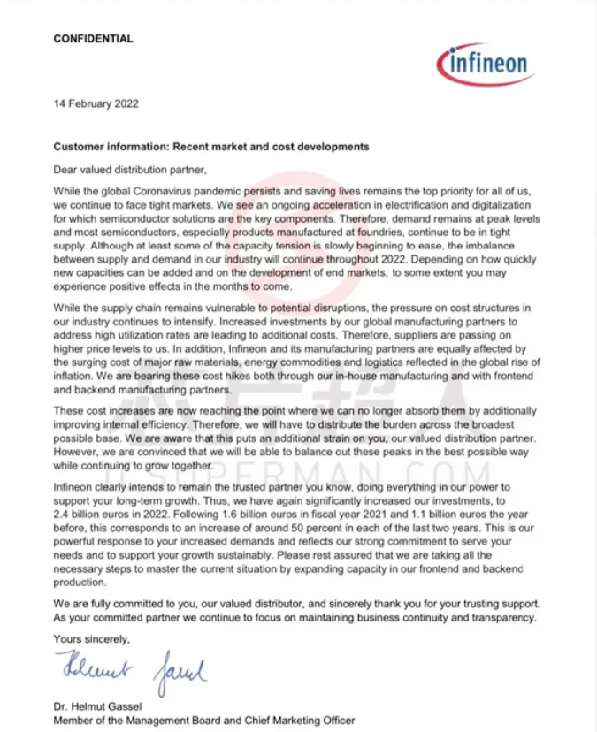 2月14日,英飛凌官方曾發(fā)出通知函,宣布將發(fā)起新一輪漲價,漲幅尚且未知。英飛凌在通知函中指出:半導(dǎo)體產(chǎn)能供需失衡將貫穿2022年全年,成本結(jié)構(gòu)上漲影響下,公司已無法再自行消化增加的成本,有意在廣泛的基礎(chǔ)上分配負擔。全球芯片供應(yīng)鏈仍處于供應(yīng)緊缺狀態(tài),仍面臨供應(yīng)鏈斷鏈的威脅,同時英飛凌正承受更高的成本壓力,包括原材料、能源以及物流成本等。