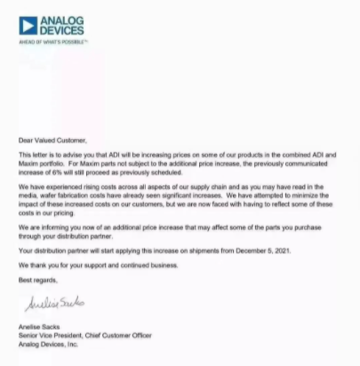 ADI在2021年末就已經(jīng)通告,宣布從2021年12月1日起,全系列漲價6%!據(jù)知情人透露,在2022年近期,ADI將宣布新一輪漲價,漲幅預(yù)計在10%以上,預(yù)計屆時市場將處于價格暴漲狀態(tài)。