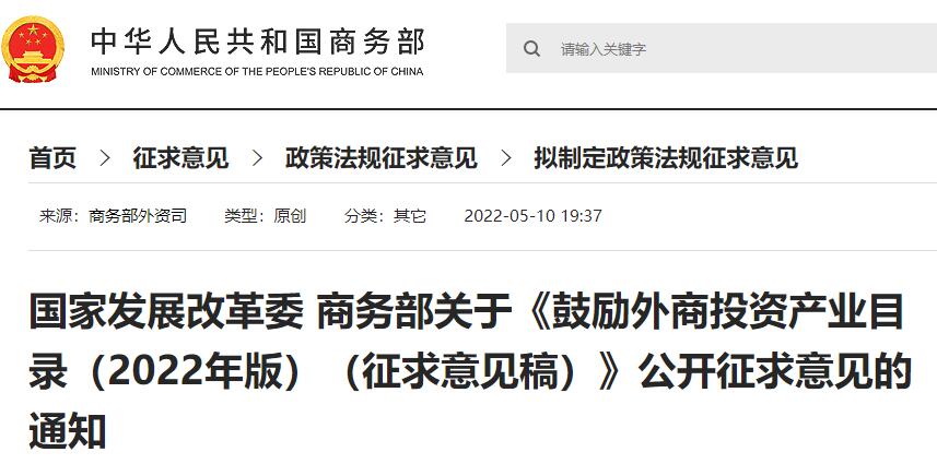 5月10日,國(guó)家發(fā)展改革委、商務(wù)部就《鼓勵(lì)外商投資產(chǎn)業(yè)目錄(2022年版)(征求意見稿)》公開征求意見。