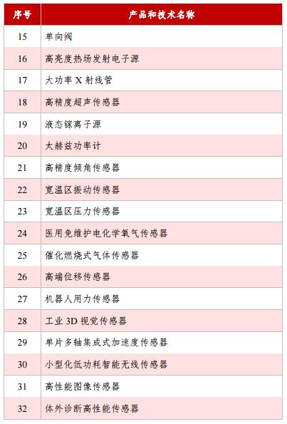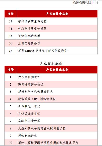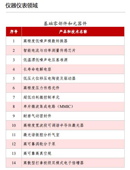 1047條產(chǎn)品和技術(shù)清單《目錄》中,儀器儀表領(lǐng)域包含53項(xiàng),包括太赫茲功率計(jì)、高精度超聲傳感器、高精度傾角傳感器、寬溫區(qū)振動(dòng)傳感器、寬溫區(qū)壓力傳感器、高端位移傳感器、機(jī)器人用力傳感器、高性能圖像傳感器、工業(yè)3D視覺傳感器等基礎(chǔ)零部件和元器件37項(xiàng),以及包括無線綜合測(cè)試儀、高頻段頻譜分析儀、超高分辨率光矢量分析儀、高性能光譜儀、大型回轉(zhuǎn)裝備超精密裝配測(cè)量?jī)x器等產(chǎn)業(yè)技術(shù)基礎(chǔ)16項(xiàng)。儀器儀表領(lǐng)域包含53項(xiàng)目錄詳細(xì)如下: