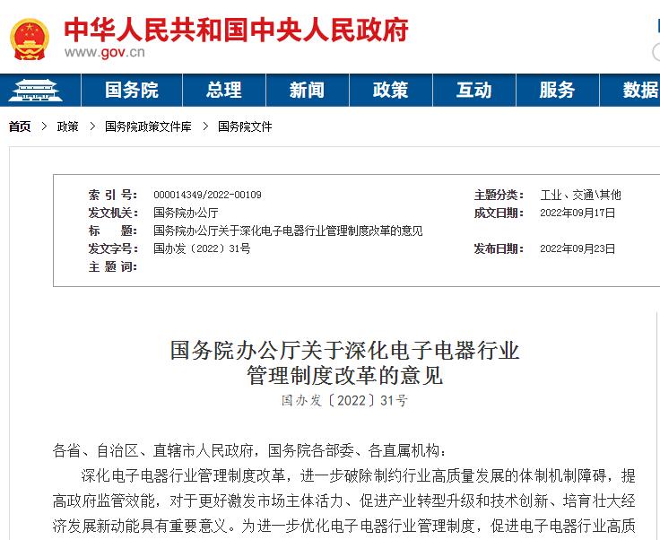 國(guó)務(wù)院辦公廳關(guān)于深化電子電器行業(yè)管理制度改革的意見