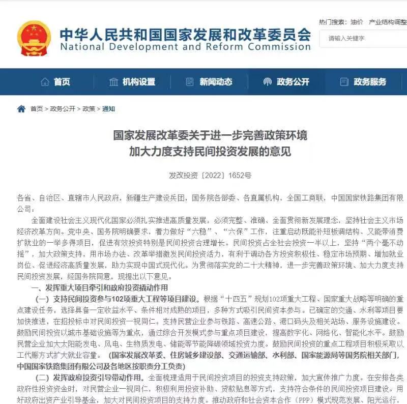 《意見》提出,支持民間投資參與102項重大工程等項目建設(shè)。已確定的交通、水利等項目要加快推進(jìn),在招投標(biāo)中對民間投資一視同仁。支持民營企業(yè)參與鐵路、高速公路、港口碼頭及相關(guān)站場、服務(wù)設(shè)施建設(shè)。鼓勵民營企業(yè)加大太陽能發(fā)電、風(fēng)電、生物質(zhì)發(fā)電、儲能等節(jié)能降碳領(lǐng)域投資力度。