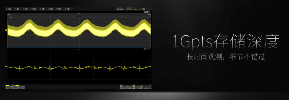 根據(jù)奈奎斯特采樣定律,為了保證采樣后的數(shù)字信號能完整復(fù)原真實信號的信息,一般實際應(yīng)用中需要保證采樣率為信號最高頻率的2.56~4倍。SDS7000A系列示波器的采樣率最高達20 GSa/s,是最高帶寬的5倍,能完美避免因采樣率不足而導(dǎo)致的信號失真。搭配最大1 Gpts/通道的長存儲深度,在長時間捕獲波形的同時,依然能使用更高的采樣率高保真捕獲波形,充分發(fā)揮4GHz帶寬性能。