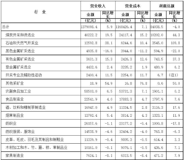2022年,在41個(gè)工業(yè)大類行業(yè)中,21個(gè)行業(yè)利潤(rùn)總額比上年增長(zhǎng),19個(gè)行業(yè)下降,1個(gè)行業(yè)由虧轉(zhuǎn)盈。主要行業(yè)利潤(rùn)情況如下:石油和天然氣開采業(yè)利潤(rùn)總額比上年增長(zhǎng)1.10倍,電力、熱力生產(chǎn)和供應(yīng)業(yè)增長(zhǎng)86.3%,煤炭開采和洗選業(yè)增長(zhǎng)44.3%,電氣機(jī)械和器材制造業(yè)增長(zhǎng)31.2%,專用設(shè)備制造業(yè)增長(zhǎng)3.4%,汽車制造業(yè)增長(zhǎng)0.6%,通用設(shè)備制造業(yè)增長(zhǎng)0.4%,農(nóng)副食品加工業(yè)增長(zhǎng)0.2%,化學(xué)原料和化學(xué)制品制造業(yè)下降8.7%,計(jì)算機(jī)、通信和其他電子設(shè)備制造業(yè)下降13.1%,非金屬礦物制品業(yè)下降15.5%,有色金屬冶煉和壓延加工業(yè)下降16.1%,紡織業(yè)下降17.8%,石油、煤炭及其他燃料加工業(yè)下降82.8%,黑色金屬冶煉和壓延加工業(yè)下降91.3%。