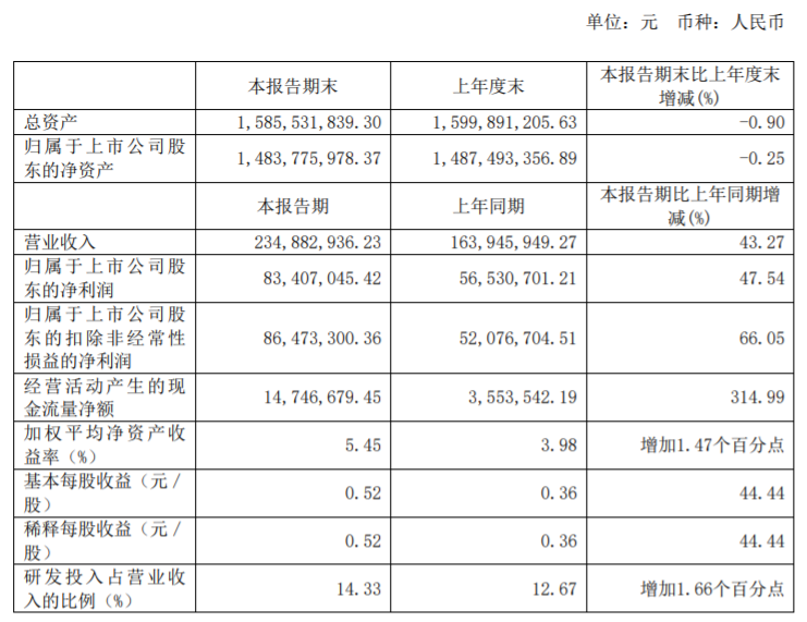 鼎陽(yáng)科技8月23日晚間發(fā)布半年度業(yè)績(jī)報(bào)告稱,2023年上半年?duì)I業(yè)收入約2.35億元,同比增加43.27%;歸屬于上市公司股東的凈利潤(rùn)約8341萬(wàn)元,同比增加47.54%;基本每股收益0.52元,同比增加44.44%。