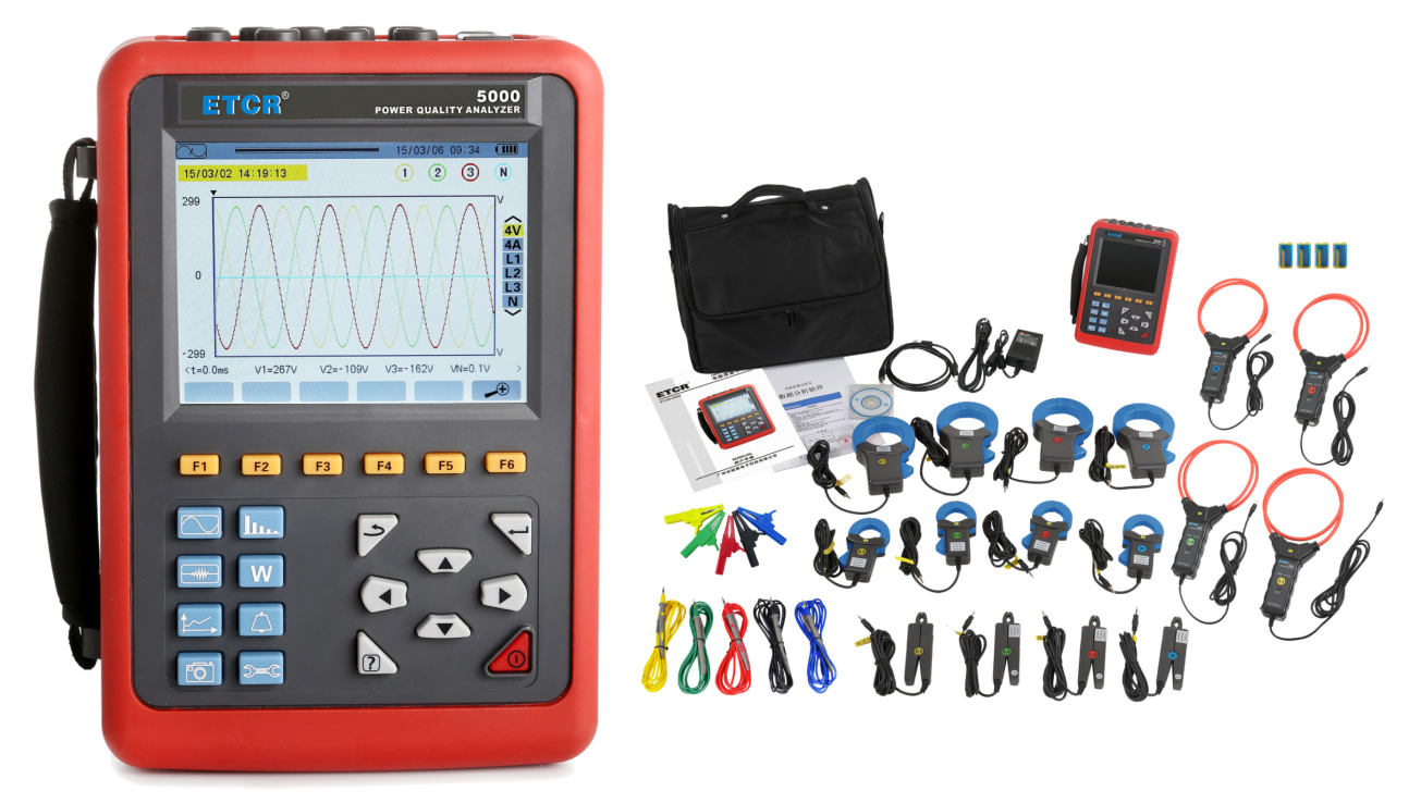 儀表由2臺(tái)手持終端、6個(gè)電流鉗、2組電壓測(cè)試線等組成,手持終端具有5寸觸摸彩屏,中文界面,大容量鋰電池,USB接口。單機(jī)具有三相伏安表、PT負(fù)荷測(cè)試、CT負(fù)荷測(cè)試、三相不平衡度測(cè)試、諧波分析等功能。