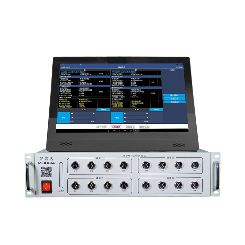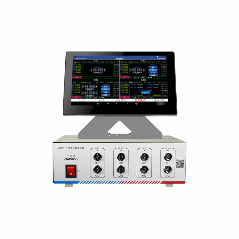 ASD989綜合測試儀由測試儀及觸控屏兩部份組成,主要用于移動(dòng)電源,戶外電源、適配器等 PCBA和成品的功能檢測、參數(shù)測試及性能評估。測試儀內(nèi)部四個(gè)獨(dú)立的PD雙向電源模塊,通訊模塊。雙向電源具有電源和負(fù)載功能,電源支持標(biāo)準(zhǔn) 、QC、PD3.1快充協(xié)議。負(fù)載支持標(biāo)準(zhǔn)、PD3.1 、QC、FCP、SCP、SSCP、AFC 、VOOC 、SVOOC協(xié)議。單臺(tái)設(shè)備可完成PCBA或成品的絕大部分功能測試。集電源,負(fù)載于一體。支持?jǐn)?shù)據(jù)存儲(chǔ)、導(dǎo)入及導(dǎo)出,可將測試結(jié)果以文檔形式導(dǎo)出至USB存儲(chǔ)設(shè)備。