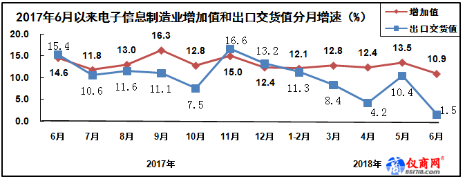 上半年,規(guī)模以上電子信息制造業(yè)實現(xiàn)出口交貨值同比增長6.1%,增速同比回落7.3個百分點;6月份,電子信息制造業(yè)出口交貨值僅增長1.5%。