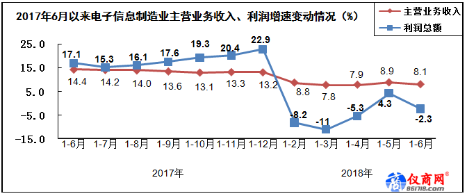 上半年,規(guī)模以上電子信息制造業(yè)主營業(yè)務(wù)收入同比增長8.1%,利潤總額同比下降2.3%,主營收入利潤率為4.27%,主營業(yè)務(wù)成本同比增長8.9%。6月末,全行業(yè)應(yīng)收賬款同比增長20.1%,產(chǎn)成品存貨同比增長12.4%。