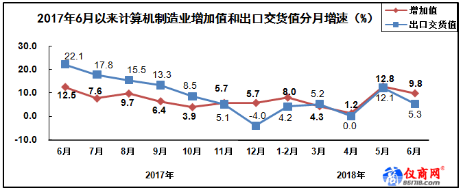 上半年,計算機制造業(yè)增加值同比增長7.6%。出口交貨值同比增長5.6%。主要產(chǎn)品中,微型計算機設(shè)備產(chǎn)量同比增長0.5%,其中筆記本電腦產(chǎn)量同比增長1.7%;平板電腦產(chǎn)量同比下降3.2%。